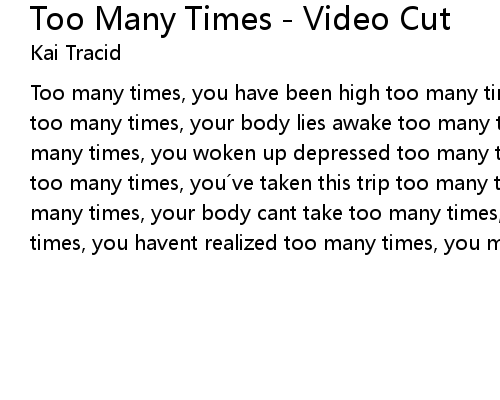 | Too many times, you have been high too many times, you ran away, in need to cry too many times, your body lies awake too many times, these pills you take... too many times, you woken up depressed too many times, you put your life to the test too many times, you ve taken this trip too many times, you have slipped too many times, your body cant take too many times, you made a mistake too many times, you havent realized too many times, you mind became paralyzed |