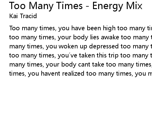 | Too many times, you have been high too many times, you ran away, in need to cry too many times, your body lies awake too many times, these pills you take... too many times, you woken up depressed too many times, you put your life to the test too many times, you ve taken this trip too many times, you have slipped too many times, your body cant take too many times, you made a mistake too many times, you havent realized too many times, you mind became paralyzed |