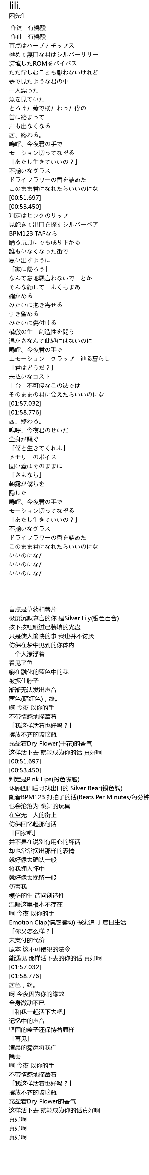 | [00:04.943] | 极度沉默寡言的你 是Silver Lily(银色百合) |