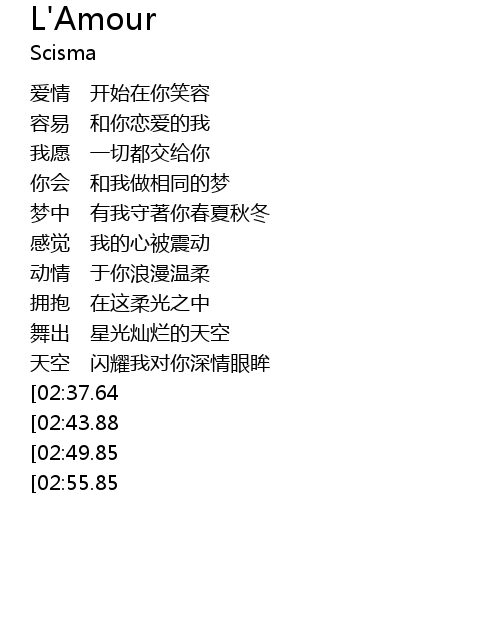 | [03:08.17][02:43.88][01:55.41][01:31.21] | LA' MOUR he ni jin jin xiang yong |