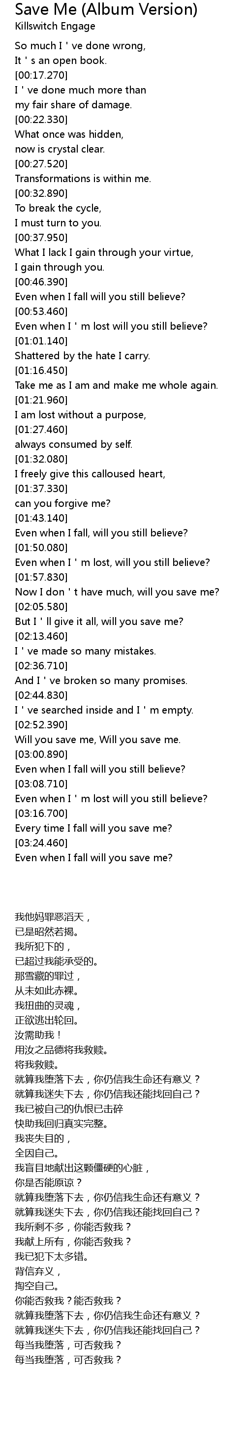 | [02:54.270] | Will you save me, Will you save me. |