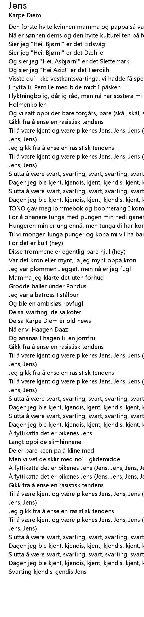| [00:43.46] | Til å være kjent og være pikenes Jens, Jens, Jens (Jens, Jens, Jens, Jens) |