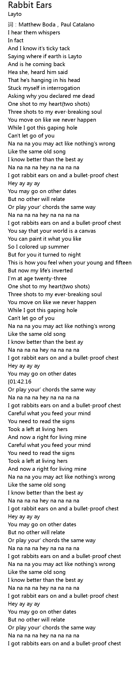 | [01:35.41] | I got rabbit ears on and a bulletproof chest |