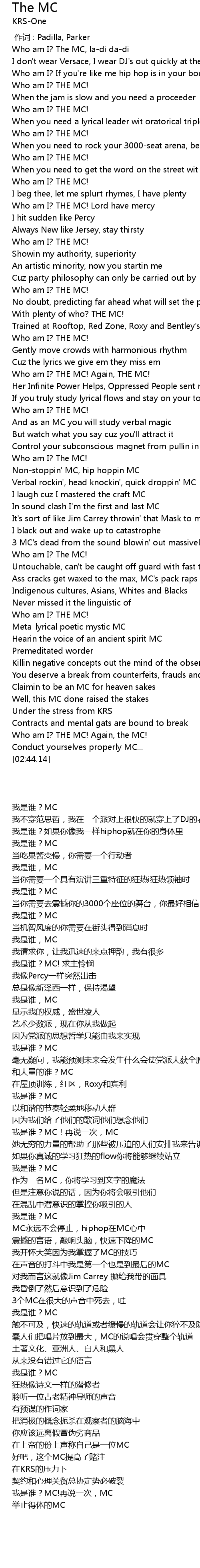 | [00:44.44] | Who am I? THE MC! Lord have mercy |