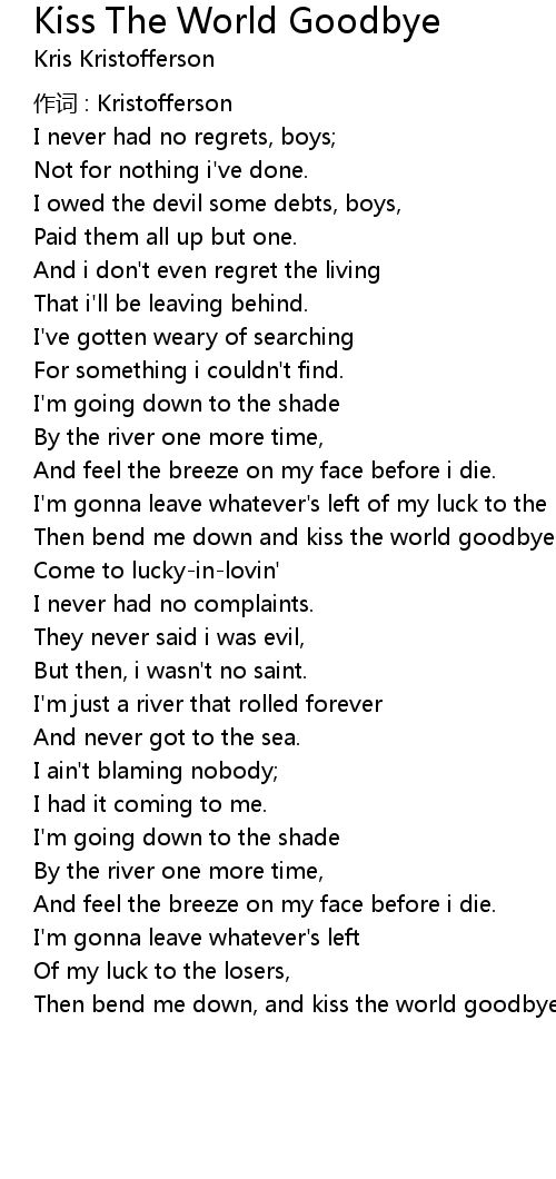 | Then bend me down, and kiss the world goodbye. |