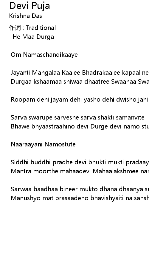 | Jayanti Mangalaa Kaalee Bhadrakaalee kapaalinee | |