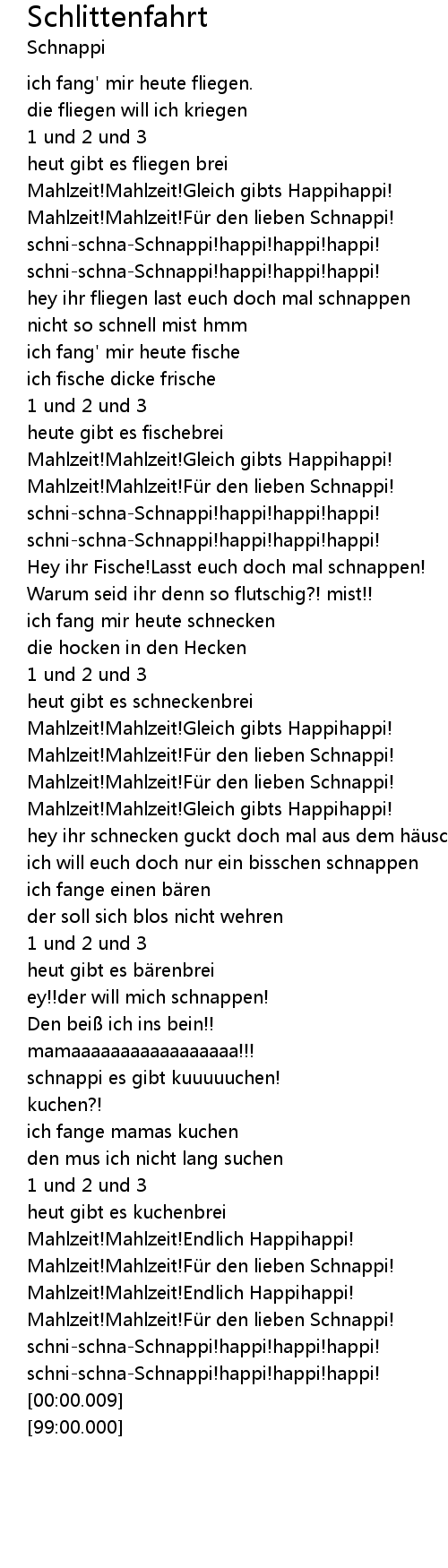 | [02:01.66] | Mahlzeit! Mahlzeit! Fü r den lieben Schnappi! |