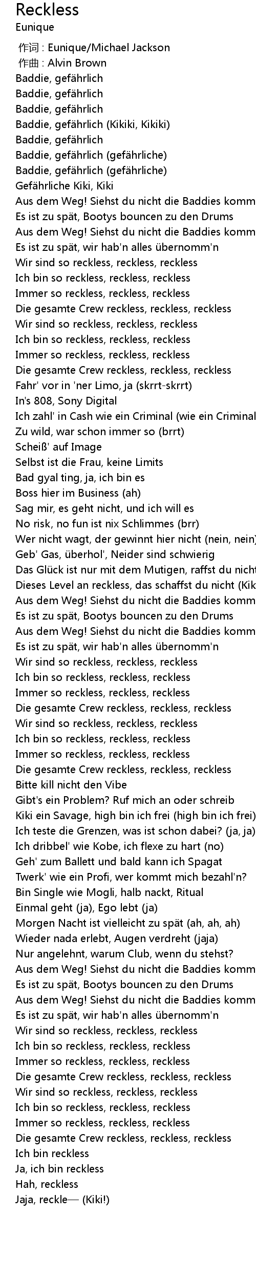 | [00:40.14] | Ich bin so reckless, reckless, reckless |