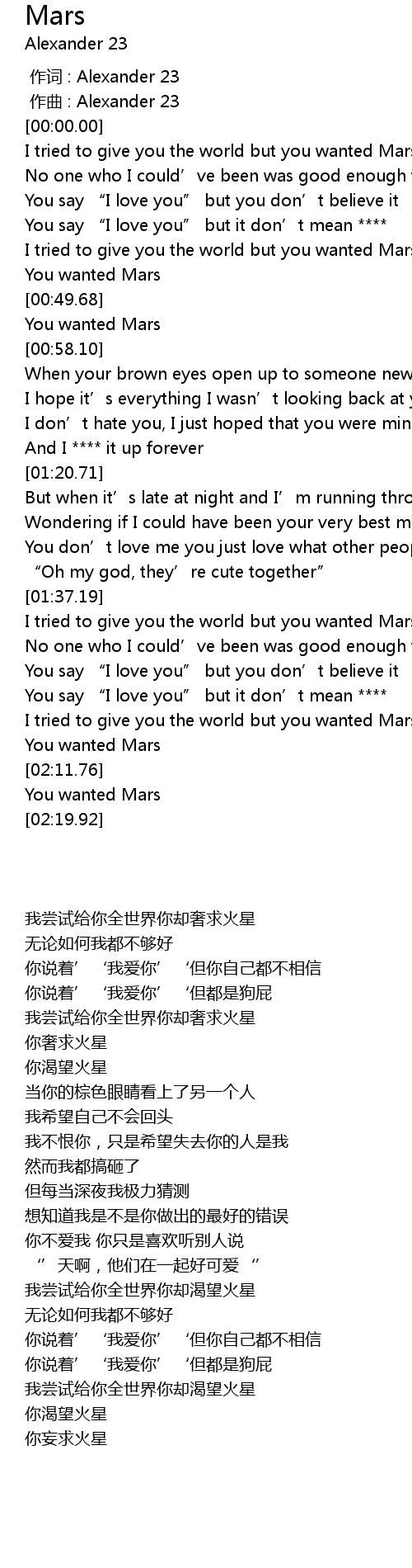 | [00:15.96] | I tried to give you the world but you wanted Mars too |