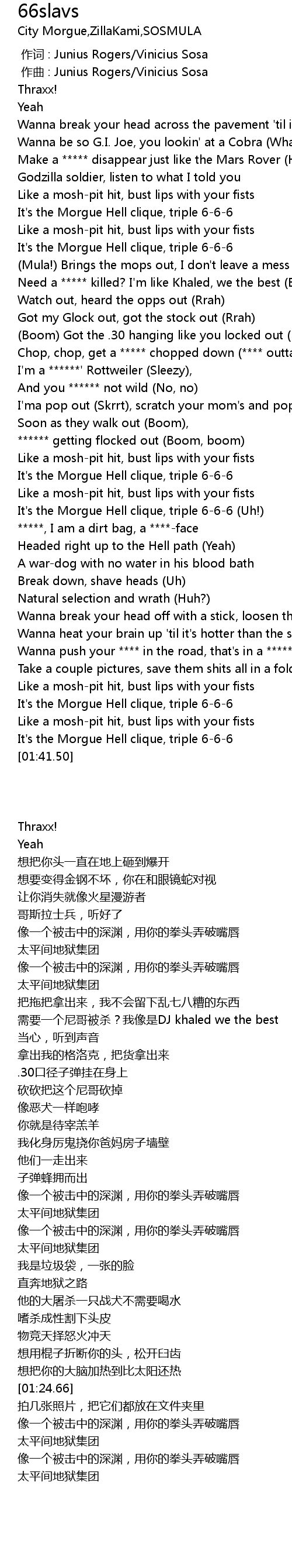 | [00:58.75] | It' s the Morgue Hell clique, triple 666 |