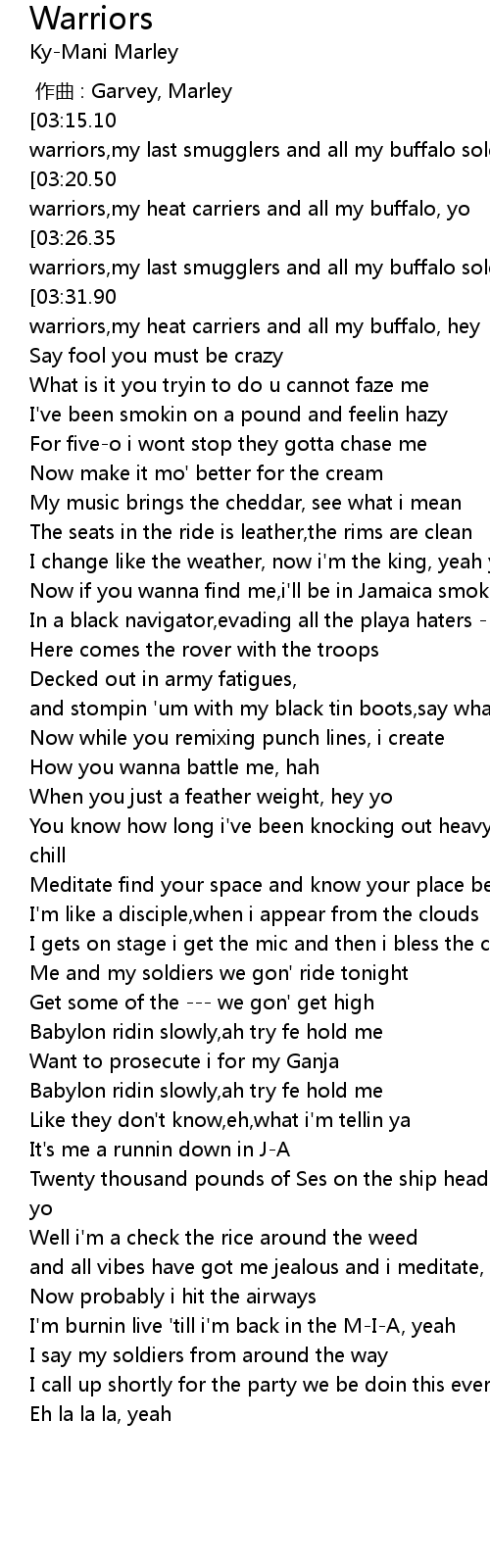 | [03:37.84][03:15.10][02:52.21][02:06.33][00:57.67][00:12.01] | "One time for my warriors,my last smugglers and all my buffalo soldiers |