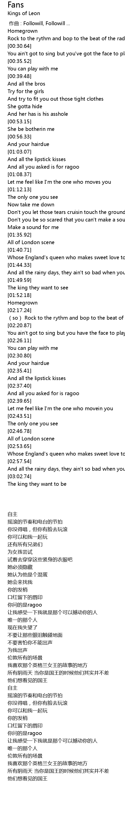 | [00:00.00] | zuò qǔ : Followill, Followill ... |