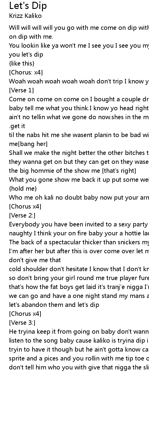 He tryina keep it from going on baby don't wanna trip in ya bed so let him listen to the song baby cause kaliko is tryina dip into that salad bowl he ain't tryin to have it though but he ain't gotta know cause you goin with me 150 1 sprite and a pices and you rollin with me tip toe out the back don't even trip don't tell him who you with give that nigga the slip and let's dip |
