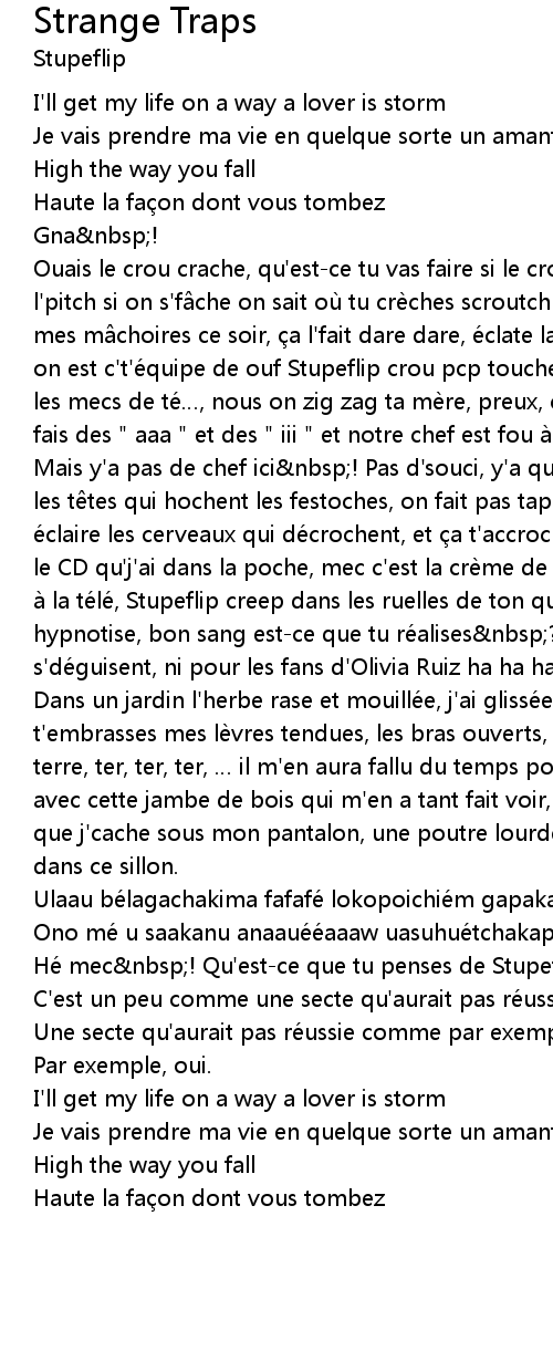 | Ouais le crou crache, qu' estce tu vas faire si le crou s' crache, tu connais l' pitch si on s' f che on sait ou tu cre ches scroutch scroutch scroutch font mes m choires ce soir, a l' fait dare dare, e clate la m choire des b tards, on est c' t'e quipe de ouf Stupeflip crou pcp touche pas a la schnouff encule les mecs de te, nous on zig zag ta me re, preux, comme les chevaliers, a fais des " aaa " et des " iii " et notre chef est fou a lier. | |