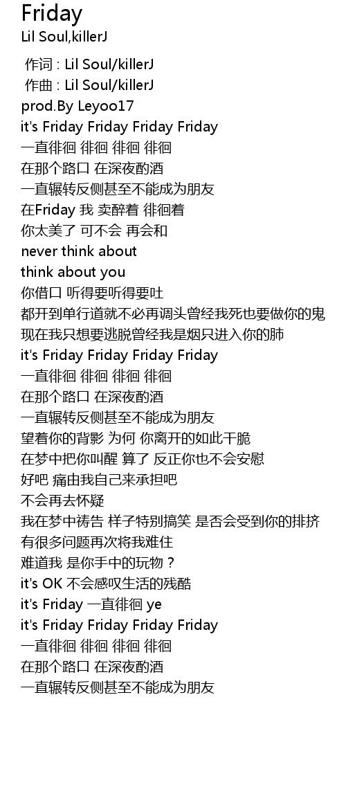 | [01:45.759] | it's Friday 一直徘徊 ye |