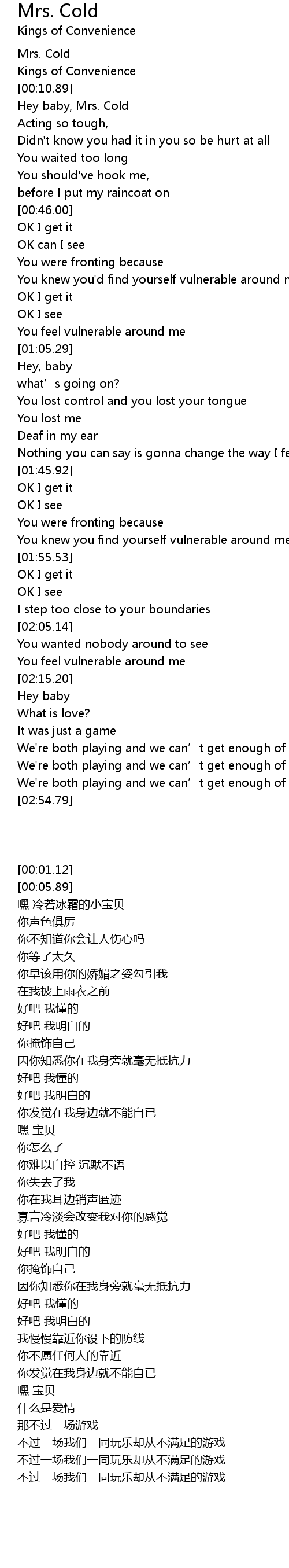 | [00:26.75] | Hey baby, Mrs. Cold |