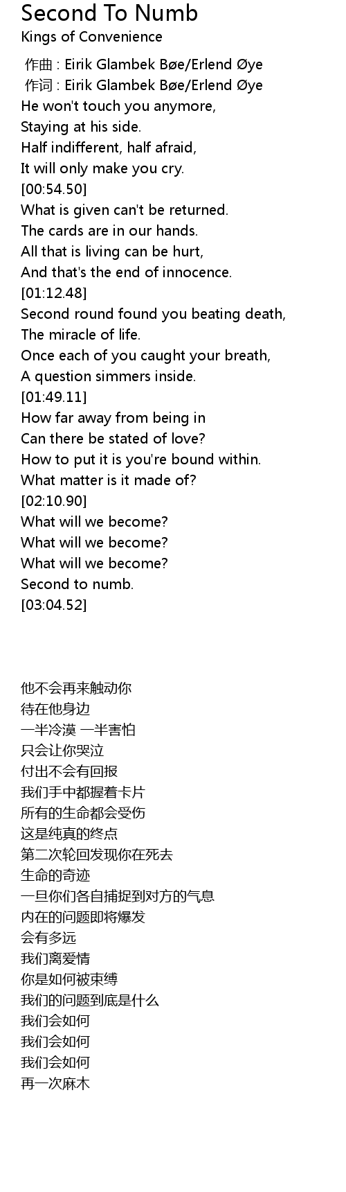 | [00:01.00] | 作词 : Eirik Glambek Bøe/Erlend Øye |