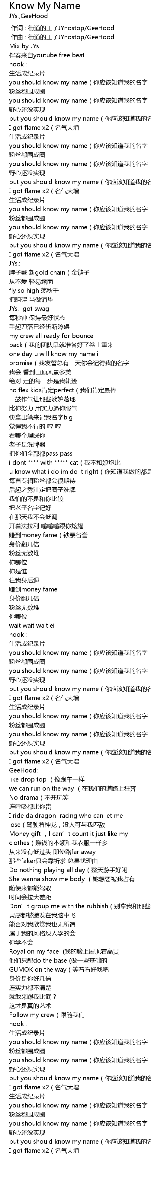 | [00:00.000] | 作词 : 街道的王子JYnostop/GeeHood |