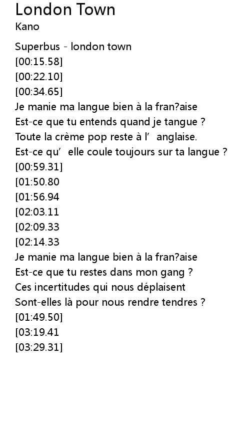 | [03:24.32][03:19.41][03:11.96][03:07.27] | Dans les rues de London Town |