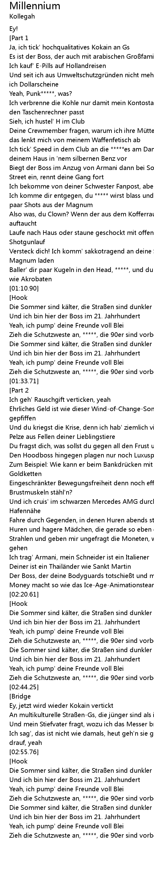 | [00:47.02] | Ich tick' Speed in dem Club an die *****es am Dancefloor, fahr' vor deinem Haus in 'nem silbernen Benz vor |