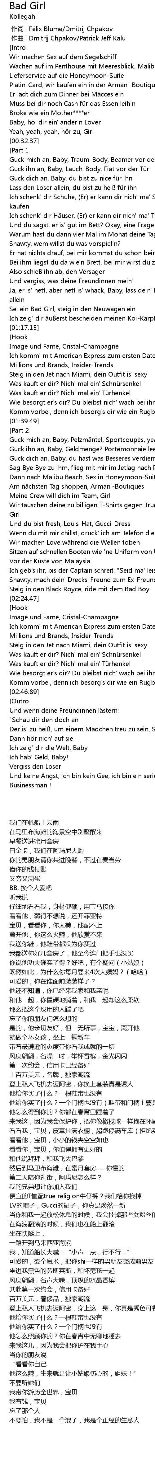 | [01:12.31] | Sei ein Bad Girl, steig in den Neuwagen ein |