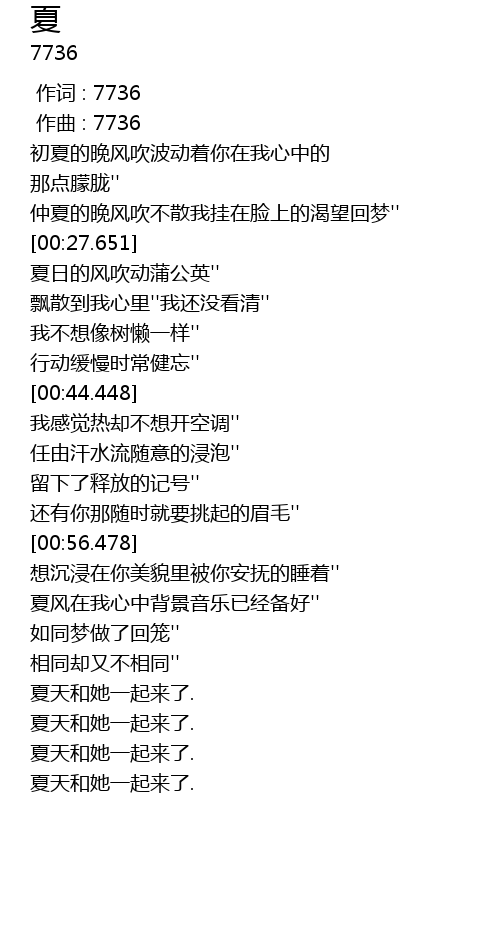 | [01:04.003] | 夏风在我心中背景音乐已经备好'' |