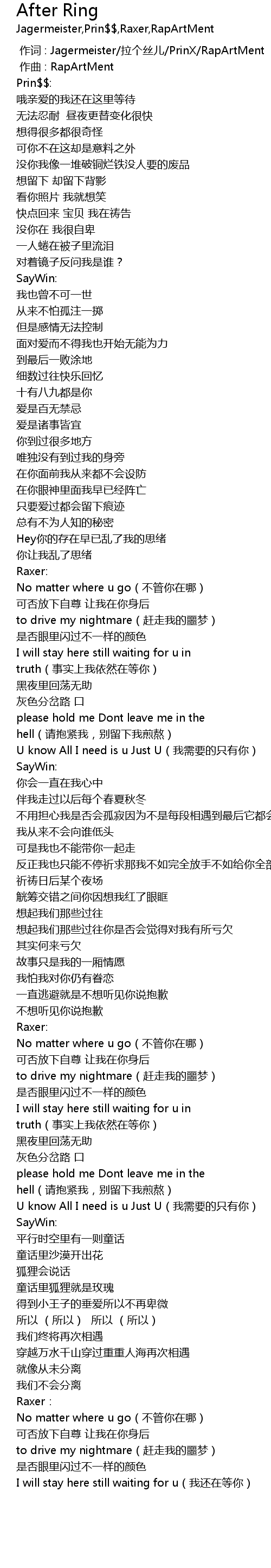 | [00:00.000] | 作词 : Jagermeister/拉个丝儿/PrinX/RapArtMent |