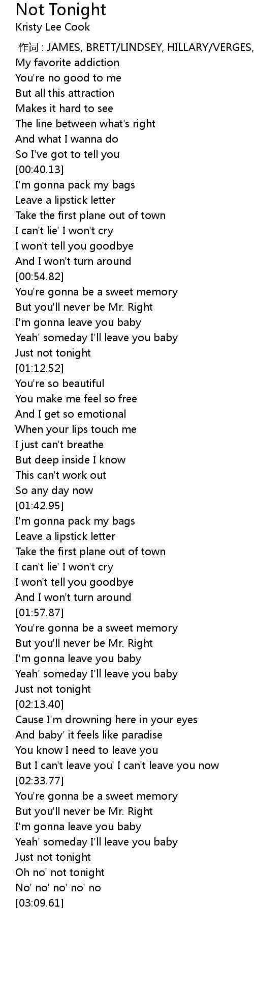 | [02:57.60] | Oh no' not tonight |