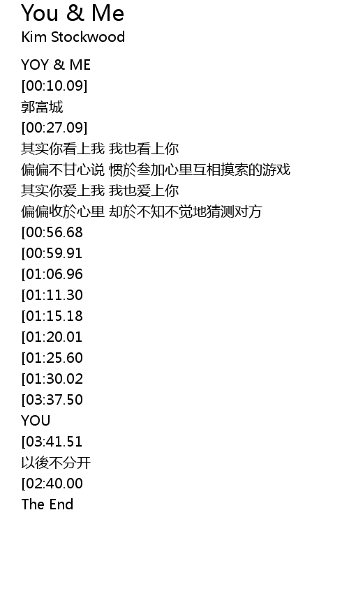 | [03:51.01][03:41.51][03:22.33][03:13.33][02:35.50][01:39.05] | YOU AND ME yǐ hòu bù fēn kāi |