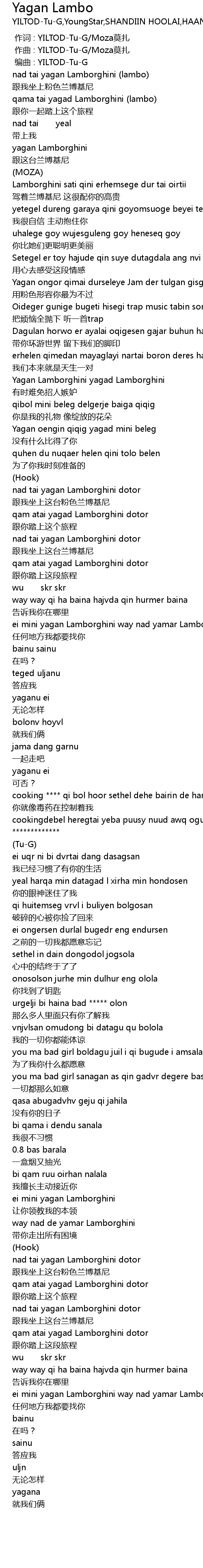 | 歌曲 | Yagan Lambo |