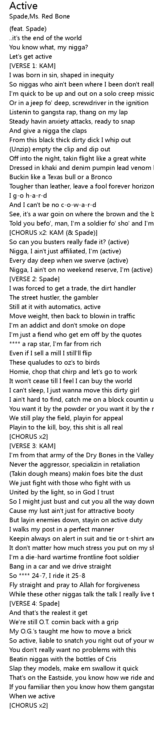 | Told you befo', man, I'm a soldier fo' sho' and I'm active | |
