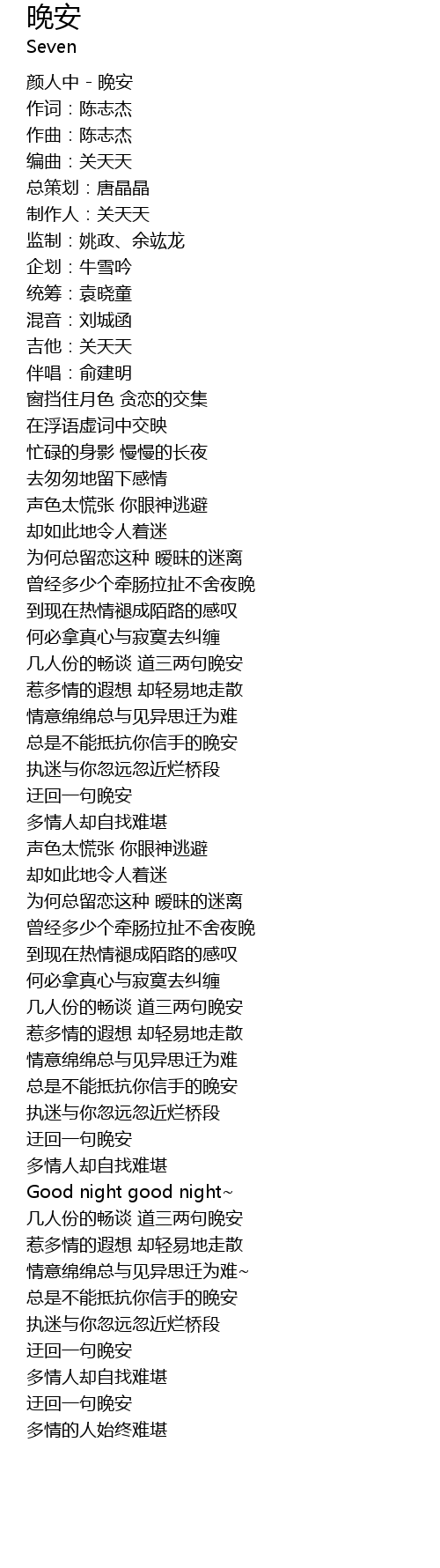 | [00:09.20] | 颜人中 - 晚安 |