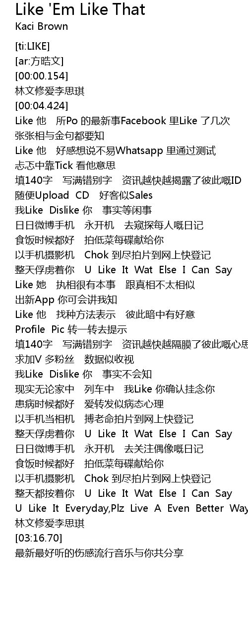 | [00:14.660] | Like ta suo Po de zui xin shi Facebook li Like le ji ci |