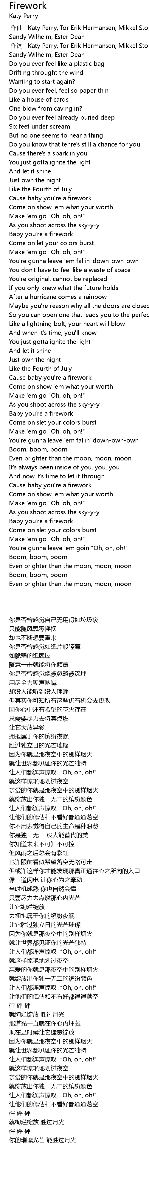 | [00:01.00] | 作词 : Katy Perry, Tor Erik Hermansen, Mikkel Storleer Eriksen, Sandy Wilhelm, Ester Dean |