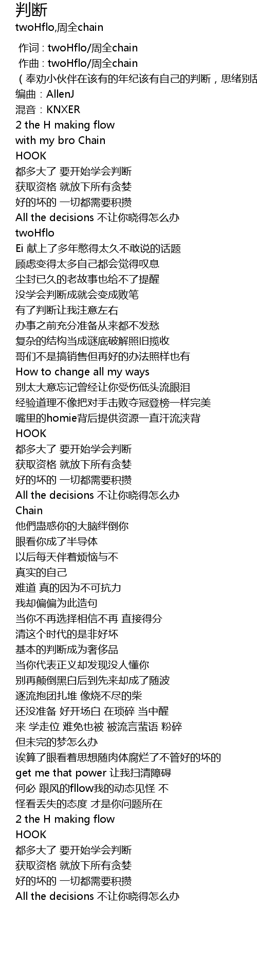 | [00:00.000] | 作词 : twoHflo/周全chain |