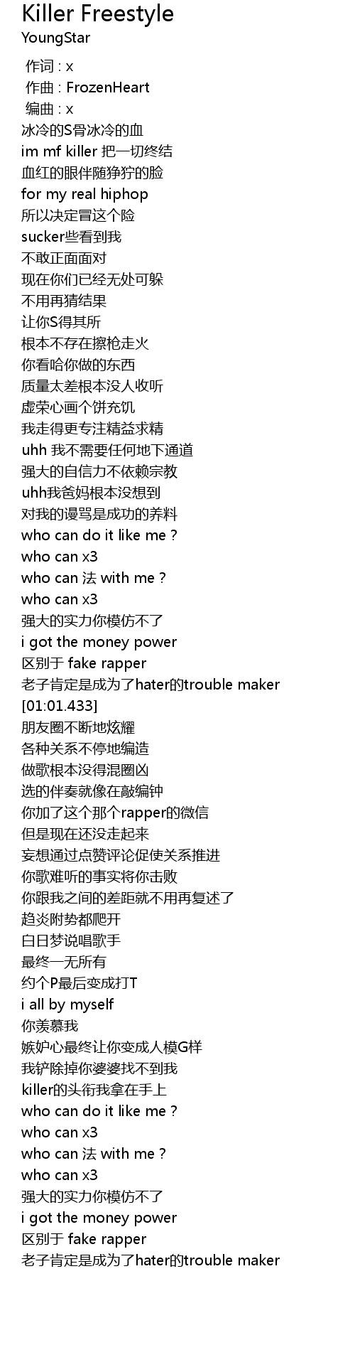 | [00:19.183] | im mf killer bǎ yī qiè zhōng jié |
