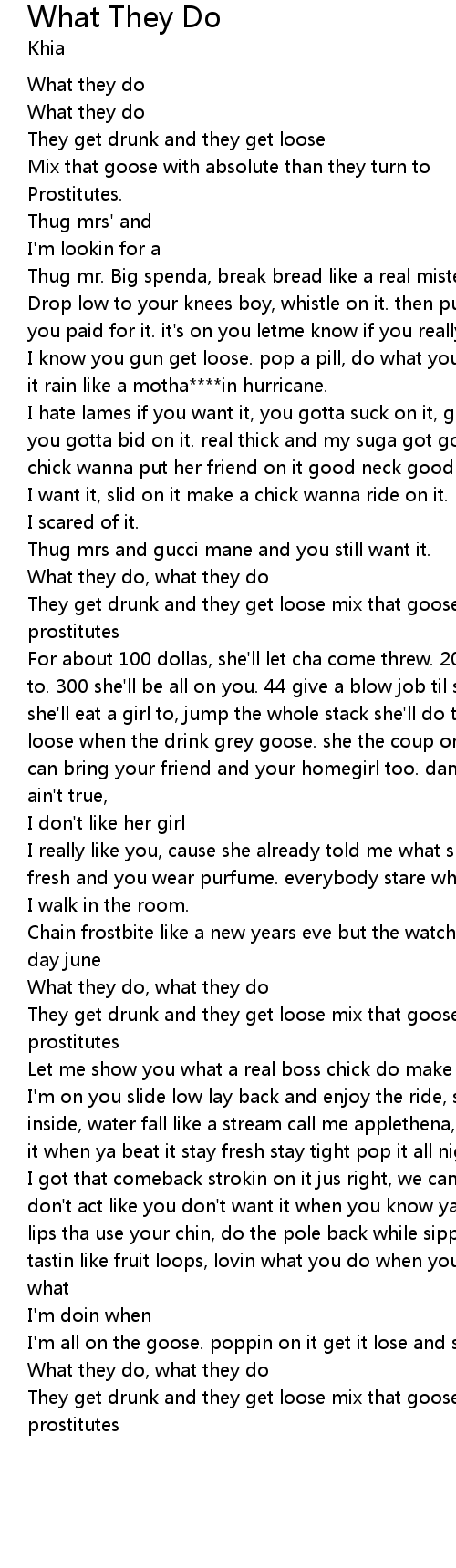For about 100 dollas, she'll let cha come threw. 200 dollas take her clothes of to. 300 she'll be all on you. 44 give a blow job til she turn blue. 500 dollas she'll eat a girl to, jump the whole stack she'll do they whole crew. hoes get loose when the drink grey goose. she the coup on rims with thw big sun roof, you can bring your friend and your homegirl too. damn what you heard babygirl it ain't true, |