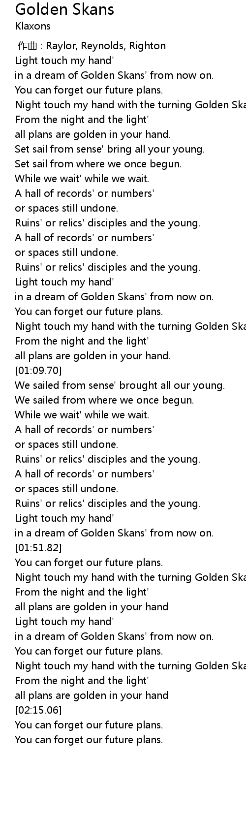 | [01:01.01] | Night touch my hand with the turning Golden Skans' |