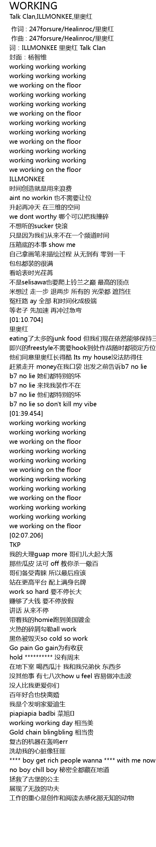 | [00:03.697] | 词:ILLMONKEE 里奥红 Talk Clan |