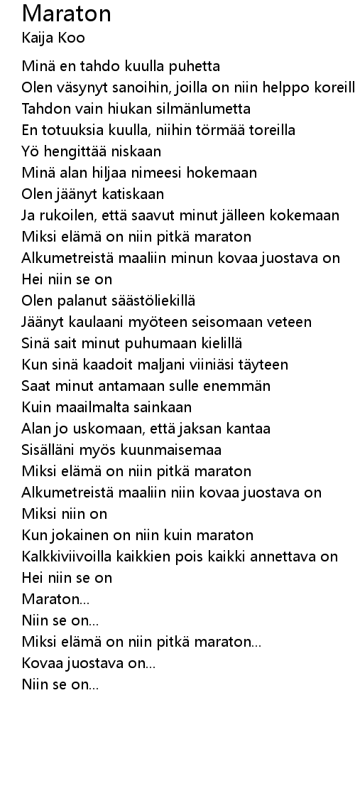 | Alkumetreist maaliin minun kovaa juostava on | |