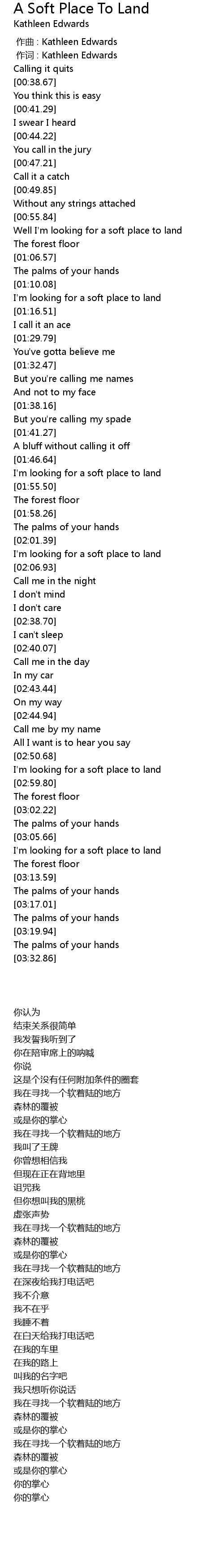 | [03:06.53] | I' m looking for a soft place to land |