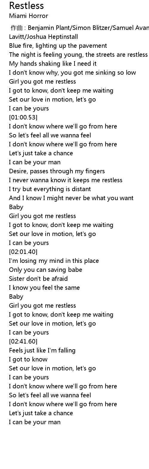 | [00:45.67] | Girl you got me restless |