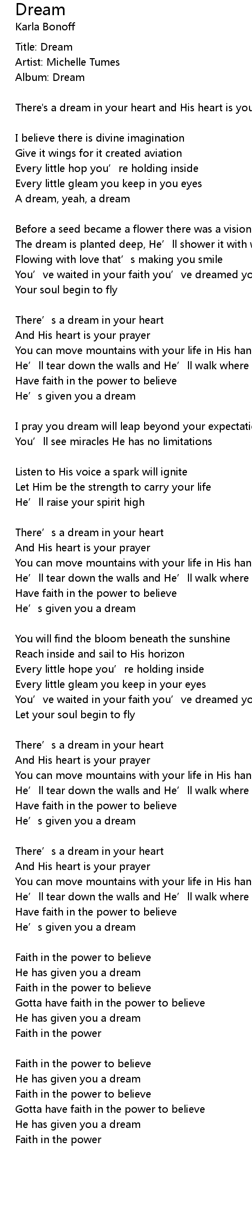 | There' s a dream in your heart and His heart is your prayer... | |