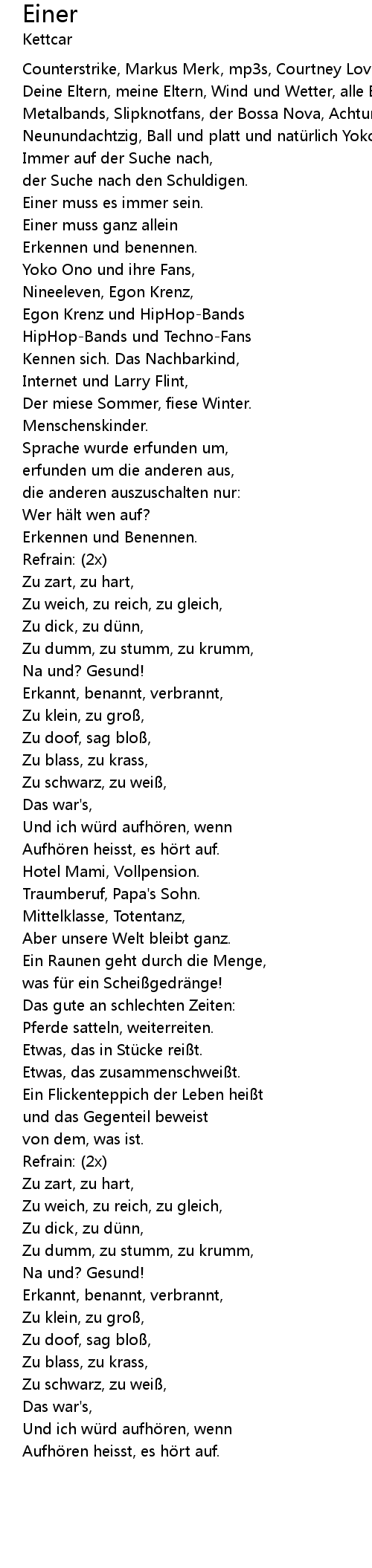 | Zu weich, zu reich, zu gleich, | |