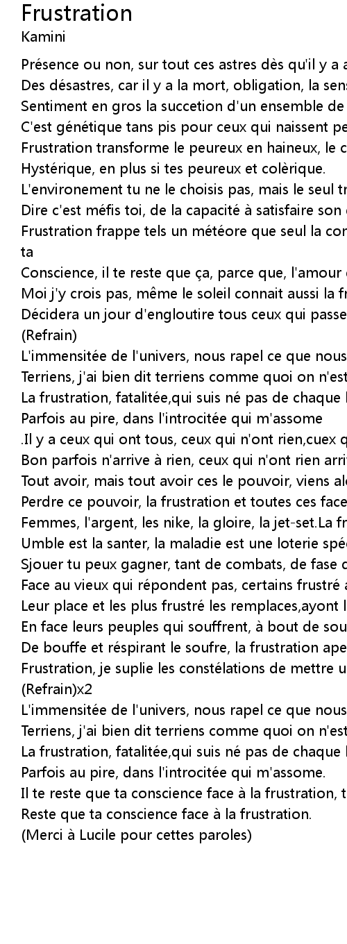 | Frustration frappe tels un mé té ore que seul la conscience peux sé sire, ouais ta | |