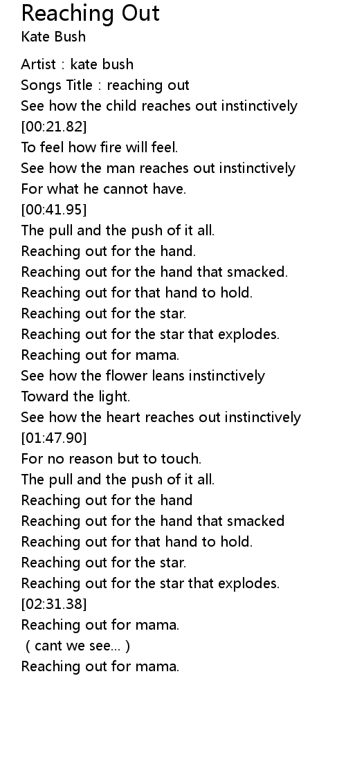 | [00:02.65] | Songs Title:reaching out |