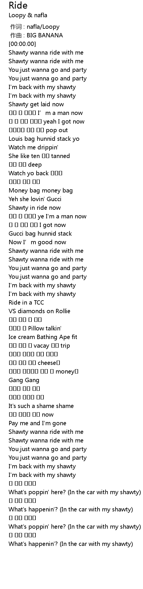 | [02:17.073] | What' s poppin' here? In the car with my shawty |