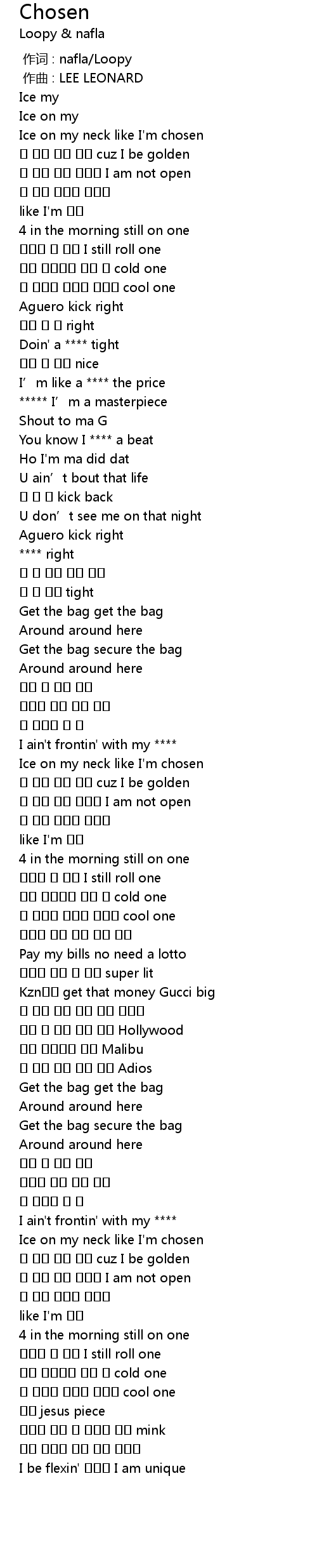 | [00:13.539] | Ice on my neck like I' m chosen |