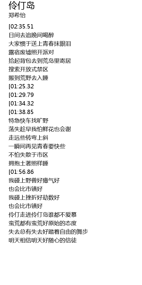 | [00:40.08][01:25.32][01:59.25] | 伶仃走进伶仃岛谁都不爱慕 |