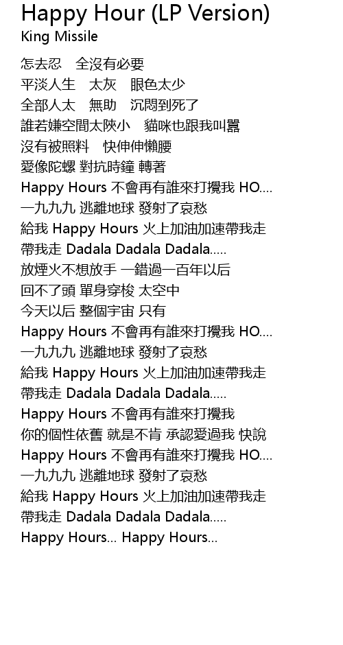 | [01:18.00] | Happy Hours bù huì zài yǒu shuí lái dǎ jiǎo wǒ HO.... |